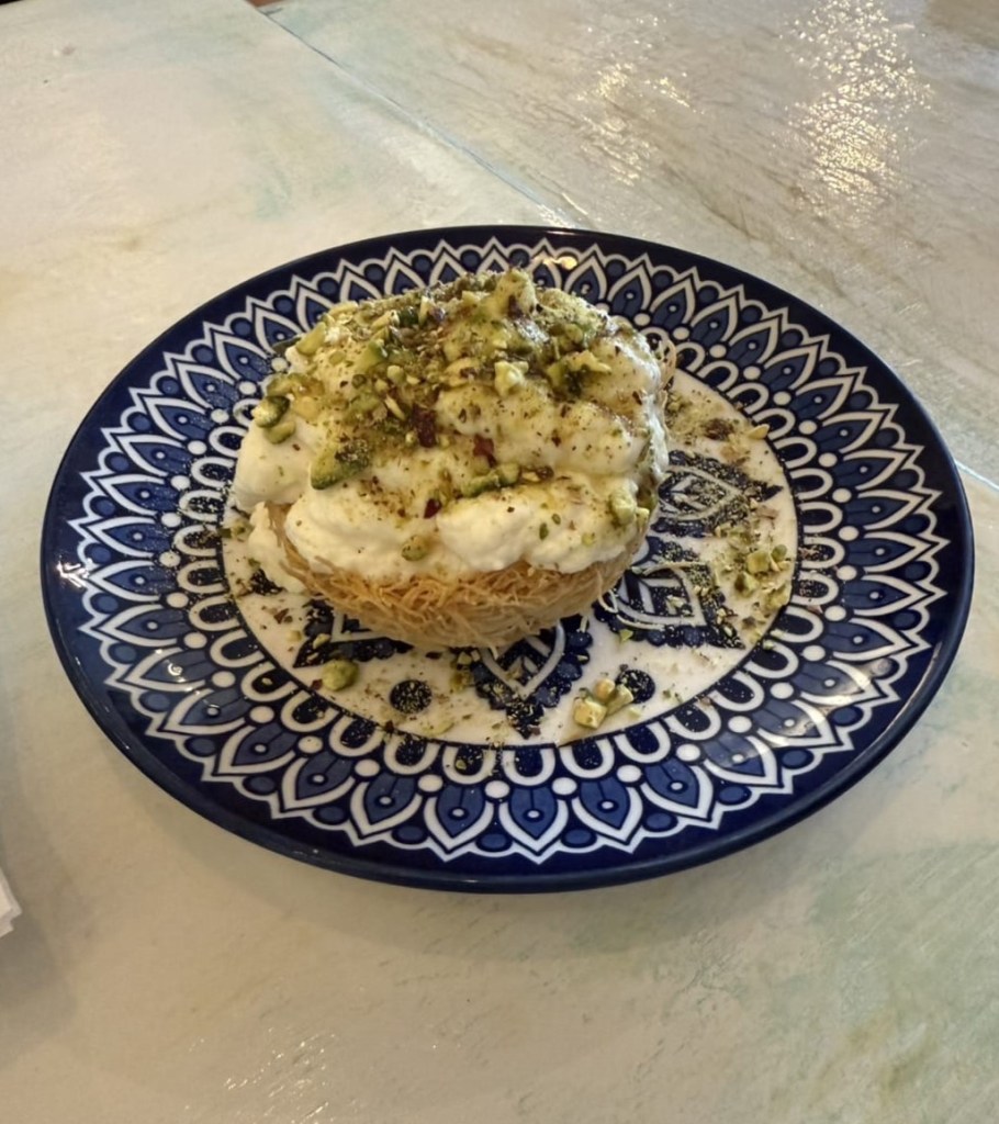 We are not quite done! Last minute, we decided to order Kashta Kunafeh Tart. I would have been so upset if I had not gotten this. The crispy fried woven dough at the bottom, along with the cream and pistachio topping, was delightful! Typically, when I have a similar dessert, it tends to be slightly sweeter than what I like, but this is perfect. The dough was not too sweet. The creamy texture and the crunchiness of Kunafeh were fantastic. AND the pistachio gives it a bit more crunch and also a nutty taste. A perfect end to this meal.