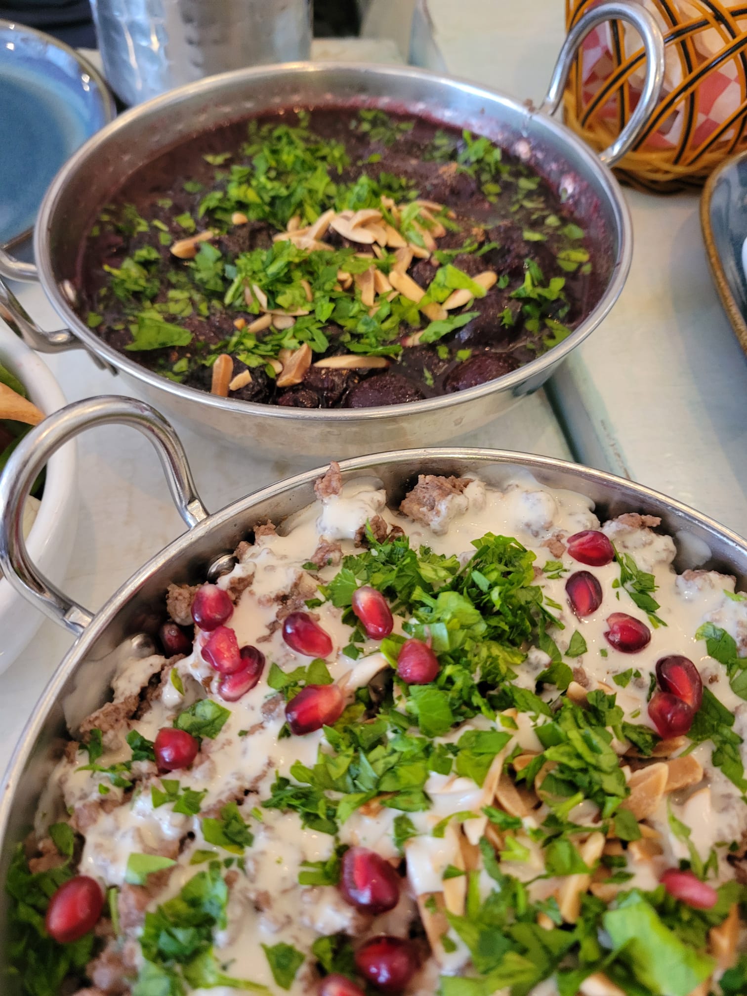 The second one also did not disappoint. This dish is called Makdous Fatteh. It has eggplants with tomato sauce over crispy pitta. It also has ground beef and tahini sauce. The round pink toppings are fresh pomegranates also served with parsley and almond.