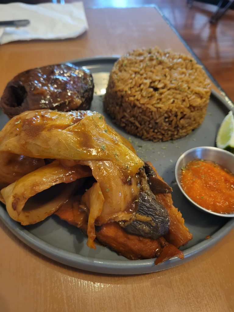 First dish that I want to review is the Thieb fish. It is served with seasoned rice, cassava, and carrot as the main ingredients. I personally really like the seasoned cabbage. The seasoning flavor really comes through as the cabbage really absorbs all the flavor and the juiciness. The seasoned rice was also excellent. The fish was also heavily seasoned but it was on a drier side. I believe that might be the way that it is intended to cook as it is supposed to be “dried fish”, but I personally have never been too much of a fan of dried fish even in my own culture. Overall the seasoning of this dish was fantastic though, I might opt out for a different protein next time.